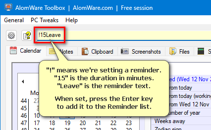 AlomWare Toolbox is probably the only app in existence that lets you set a quick reminder on your PC at any time (no matter which app you're using), and in a minimum of 6 keystrokes without even touching the mouse! Now, this is assuming your reminder is for an hour or less away, and that you're happy to use one single character of text for the reminder message; but it's doable! ;D