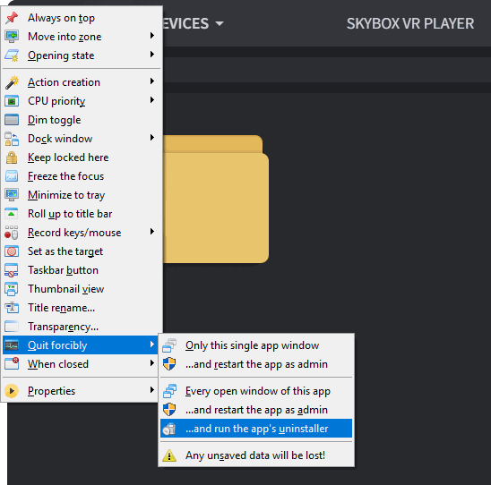 For example, say you're testing "SkyBox VR Player" but decide you don't want it. Here's a screenshot of middle-clicking SkyBox's window icon to quit and uninstall it in a few clicks: