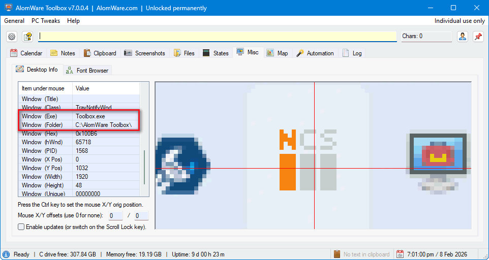 However, let's look at the user's question a bit closer. The user wants to identify the app used, because he has no way to know what it is. Under AlomWare Toolbox's "Misc" tab is another tab called "Desktop Info". If you enable updating of stats in that tab, you can hover the mouse over anything on your desktop to get info about it (such as color picking, text copying, window info, and app identification). So as an example, if we hover the mouse over AlomWare Toolbox's icon, we can see that it belongs to an app called "Toolbox.exe" which is located in the "C:\AlomWare Toolbox" folder. The user at top could do this same process with his unknown Caps Lock app to discover which app it is.