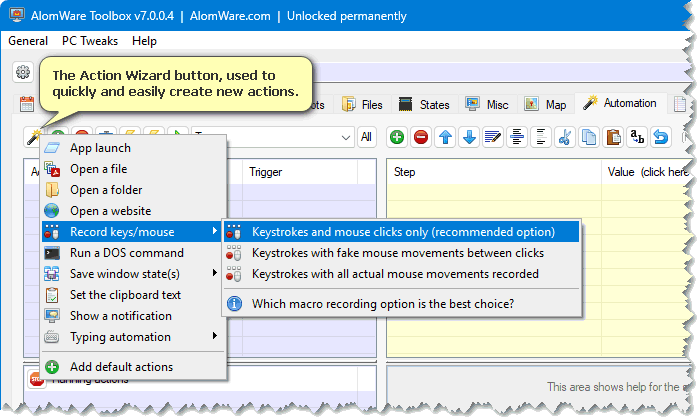 AlomWare Toolbox solution: The app was made for this! Unlike AutoHotkey's horrible and unfriendly text-based coding, just start AlomWare Toolbox's macro recorder by clicking the "Action Wizard" button in the "Automation" tab, and choose "Record keys/mouse > Keystrokes and mouse clicks only". A message is shown and recording starts one second after you close it.