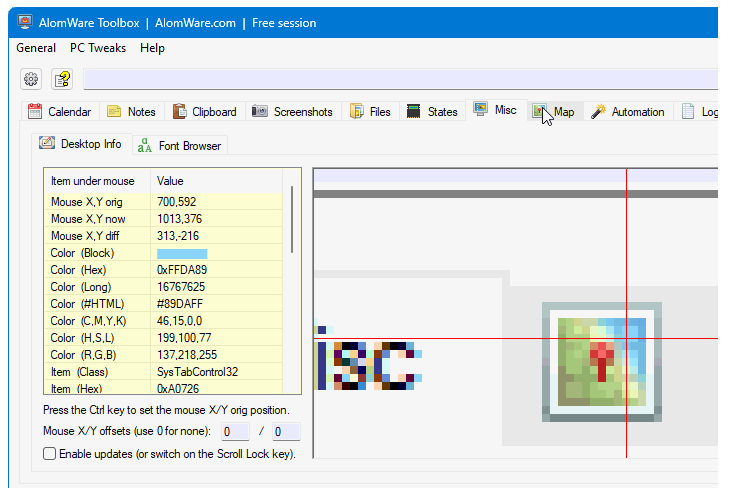 Move the mouse around the desktop to see a magnified image of where the mouse is, as well as stats for the item under the mouse (such as colors in RGB, CMYK, text, etc).