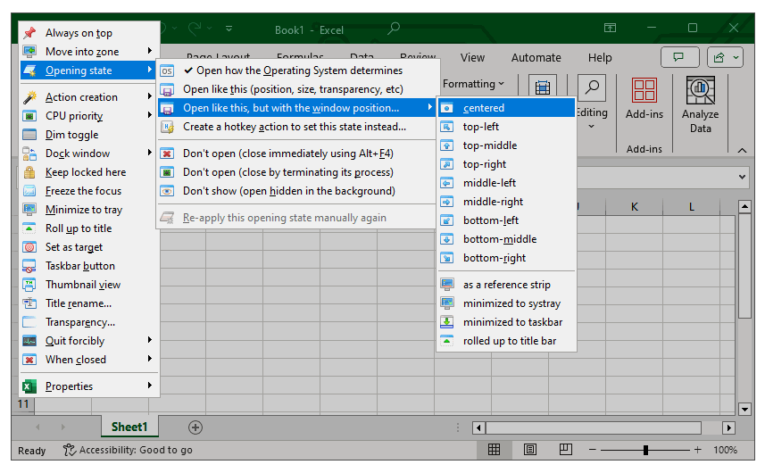 Using the Power menu items, set up the window the way you want, such as always on top of all others, maximized, dimmed, transparent, its process priority, etc.