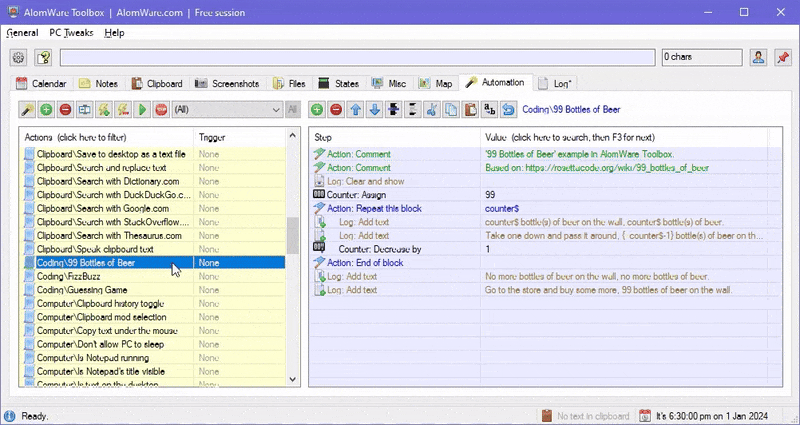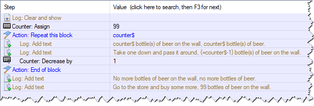 Figure 11 shows an example action that repeats a block 99 times to display the famous "99 Bottles of Beer" song in AlomWare Toolbox's Log tab (Figure 12). In this action, counter$ is a variable can be assigned any starting number that you like (99 in this case), which can then be increased or decreased with the Counter: Increase by or Counter: Decrease by steps. The {=counter$-1} text in the action is a real-time calculation which subtracts 1 from the current counter$ value, because any text inside {= and } is deemed to be a calculation. The Log: Add text steps shows a block of text in the Log tab, which in this case is the song text.
