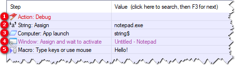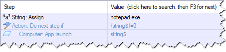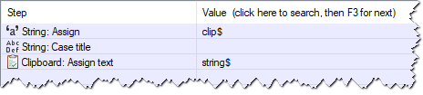 Some steps can use built-in variables for the value, which means you specify a specific reserved word for the value which gets replaced when the step is run. Variables always end with a dollar sign ($) for easy identification, and as their name implies, their value varies and may not always be the same. An example variable is time$, which holds the current time of your PC. This means a two-part step made up of Clipboard: Assign text with a value of time$ will put the current actual time in the clipboard when the step is run, as opposed to literally putting the text "time$" in the clipboard.
