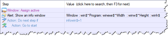 Figure 9 shows an example action that shows information about the active window. It repeatedly restarts the action (the Action: Go to start step) while the info window is open (the infowin$ value is 1). Note that step 4 is indented to show that it's affected by the step directly above it.