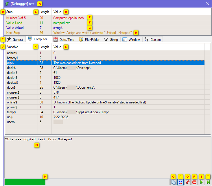If an action isn't working as expected, you can put Action: Debug as its first step (or in any other step position) to make the action pause after each step is run. This opens a debug window (Figure 4) that allows you to examine the action's current variable values so you can confirm if they are what you expect. In Figure 3, the example action shown has five steps that auto-pause after each step is run, and you advance to the next step manually by either pressing the [Enter], [Space] or [Right] keys, or clicking the "Advance" button (item T in Figure 4).