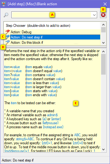 Steps of an action are normally run in top-down order, one after the other. However, sometimes an action should not be permitted to run unless certain conditions are met, such as actions that require running from a hotkey. As such, any of the following steps can go at the start of action so it can gracefully abort if the conditions aren't met: