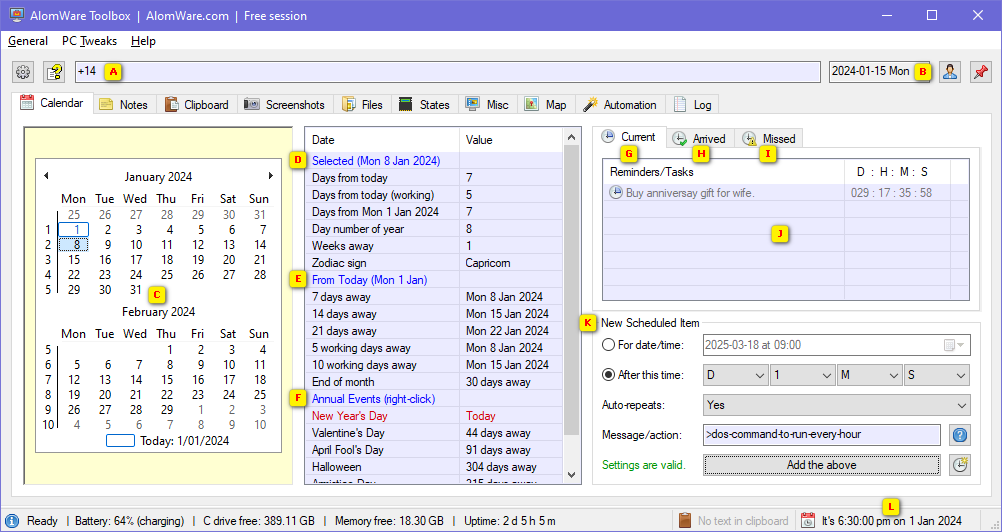 Disclaimer: AlomWare Toolbox's calendar is intended solely for visual browsing of dates, and for doing date calculations. You can't set appointments, notes or schedules with it. For these, you will need to seek an alternative product.