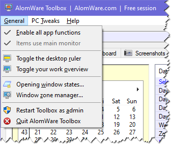 - Items use main monitor - This item will be disabled if your PC has only one monitor, but if you have more than one, then ticking this will make AlomWare Toolbox prioritise window placement to whatever monitor is set as your main one in Windows. For example, centering a window will be to that main monitor only. If unticked, then centering a window will be based on the center all of monitors (that is, your large virtual desktop). Note: There is an automated action step called Window: Use main monitor, which can be used in an action to override this menu setting for that particular action.