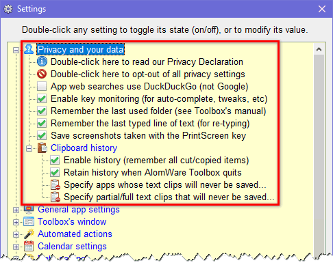 In the Settings of AlomWare Toolbox (Figure 1), there's a section at the top called "Privacy and your data" (Figure 2) where you can choose what AlomWare Toolbox does with your data. For example, you can set it to not remember your copied clipboard text, or not to remember certain types of clipboard text (such as your credit card number, address, etc). You can set it to not save screenshots, or to use DuckDuckGo instead of Google when AlomWare Toolbox does a web search for you. You're in complete control!