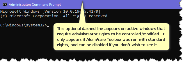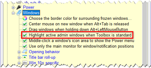 Settings gear icon at the top-left of the window (Figure 1) and then navigate to and tick the option called "Tweaks for your PC > Windows > Highlight active admin windows when Toolbox is standard" (Figure 2). Now when you click (make active) a window that needs administrator rights, a dashed blue/orange admin line will appear across the top of it for identification (Figure 3). Nice!