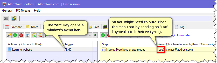 Actions that are triggered with [Alt] as part of a hotkey trigger might open a window's menu bar briefly, which is normal but unfortunately can interfere with the typing. If this applies to you, you will need to specify {esc} at the start of the typed text to forcibly close the menu before typing the rest (Figure 1).