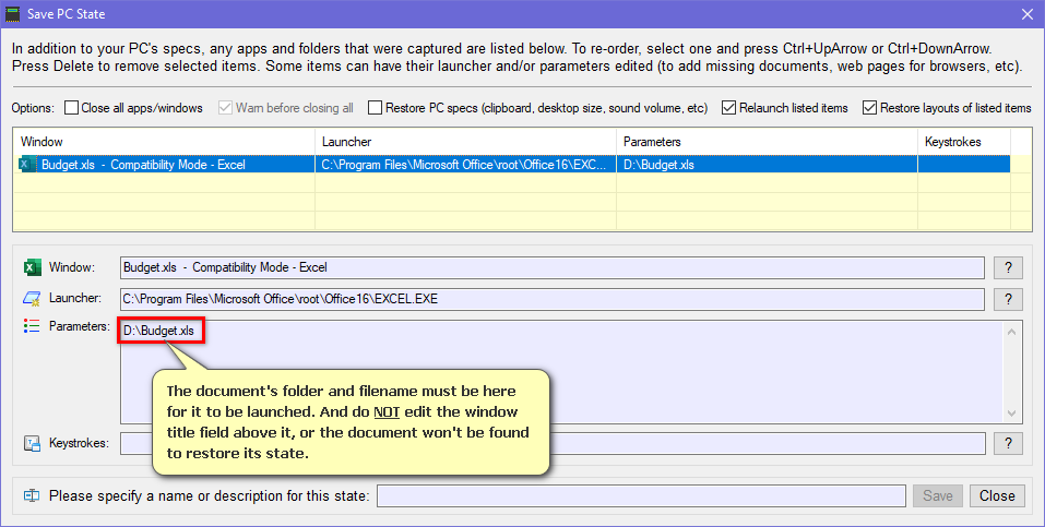 If a PC state isn't launching a document that was snapshotted with it (such as an Excel spreadsheet), then you need to check that the folder and filename of that document has been entered into the PC state's "Parameters" field (Figure 1). Normally this is done automatically when a snapshot is taken, but it can sometimes fail for certain documents and will therefore need your manual editing.